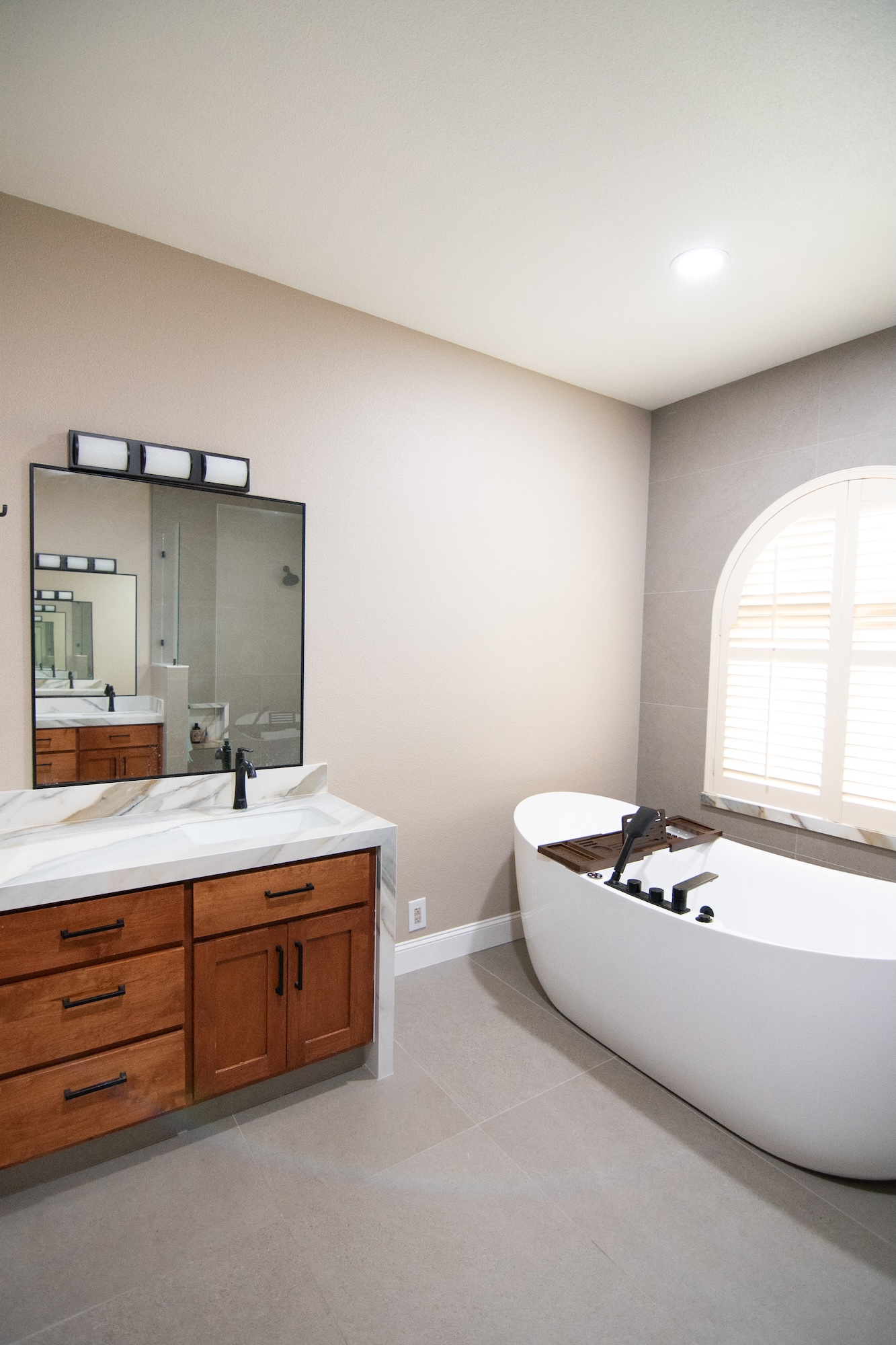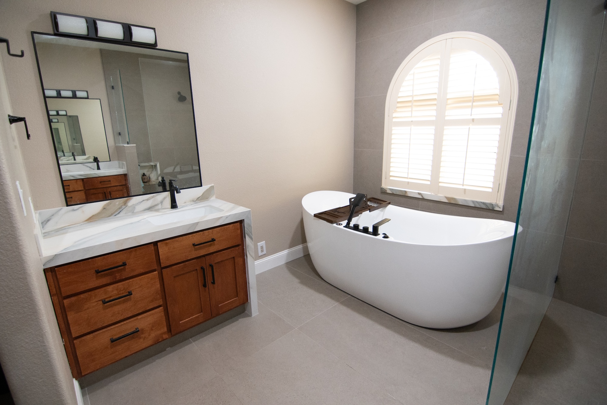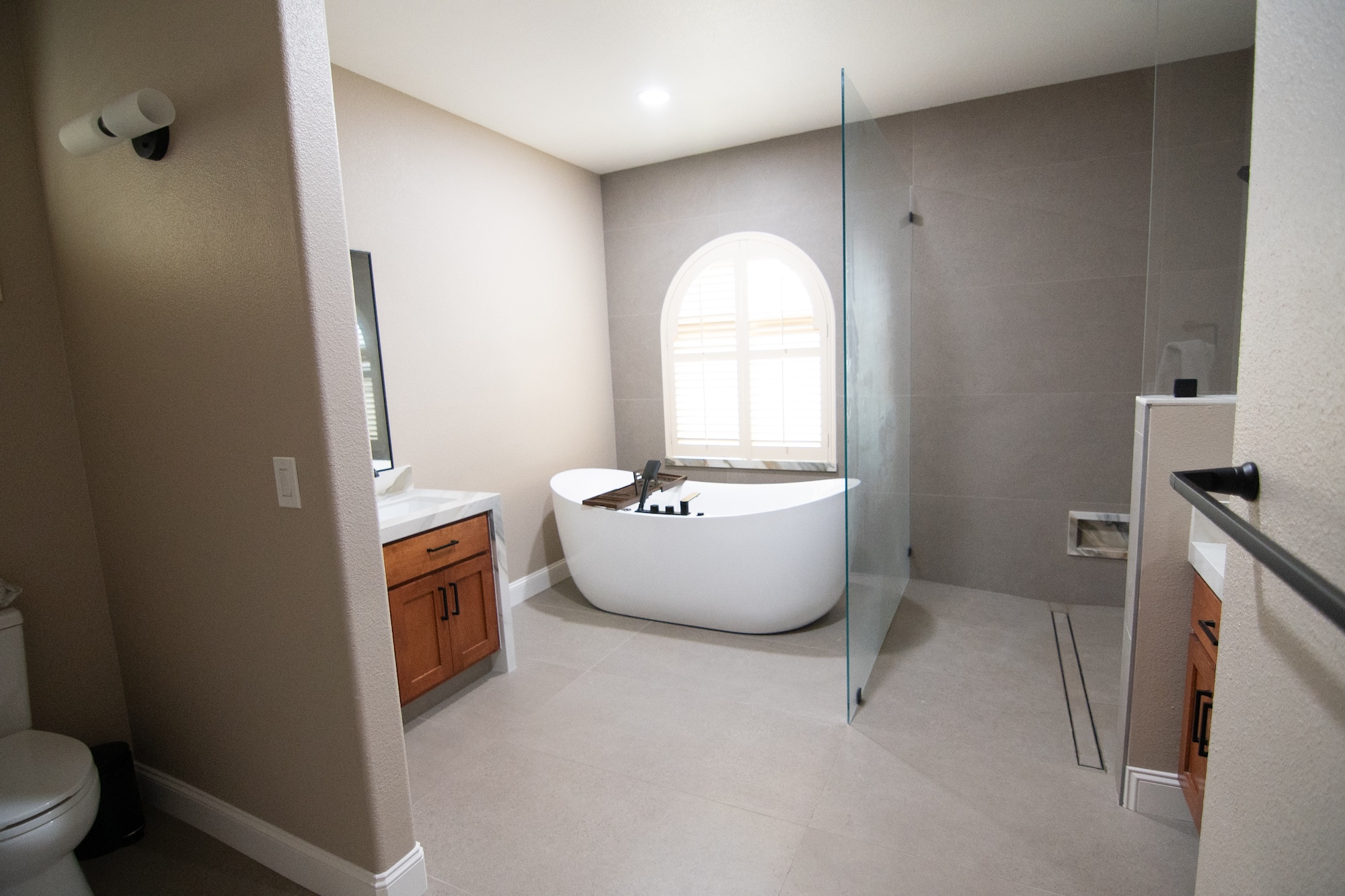 This luxury bathroom remodel in Modesto, CA creates a spa-like retreat designed for comfort, relaxation, and modern style. The space features a striking freestanding soaking tub positioned beneath an arched window, allowing natural light to highlight the elegant design while creating a peaceful atmosphere.