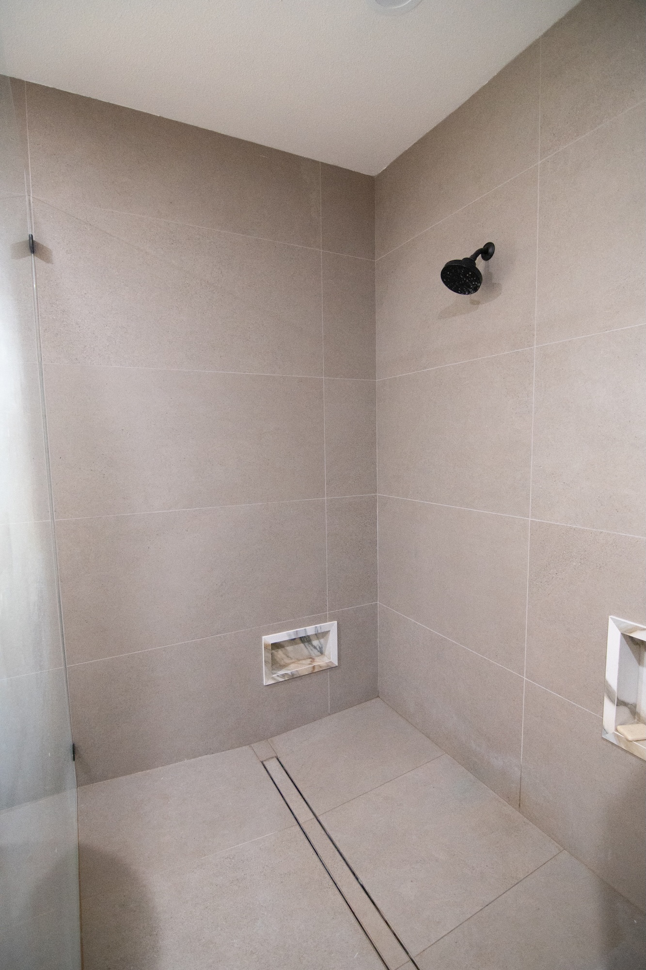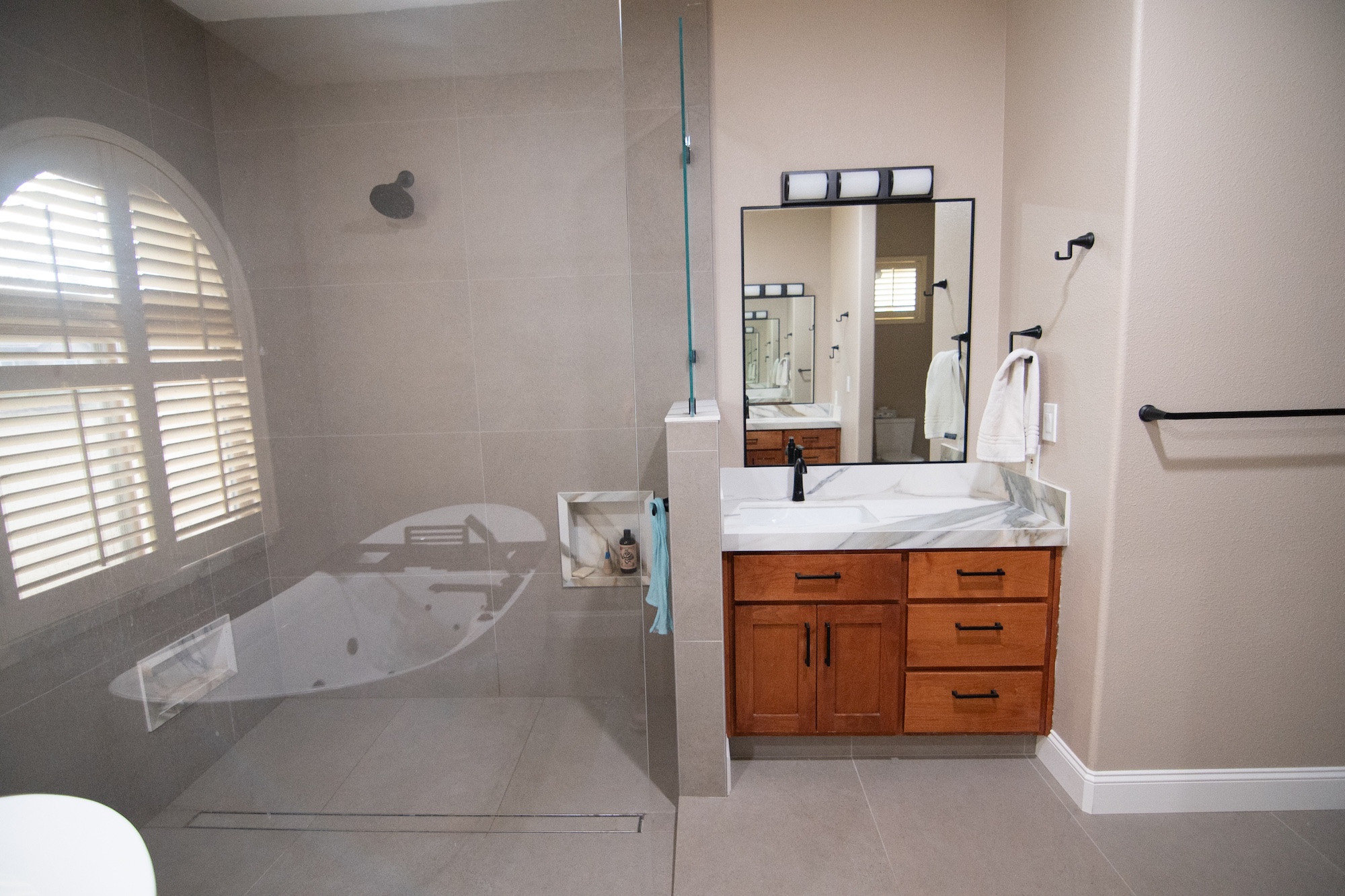A spacious walk-in shower with sleek frameless glass panels provides a clean, open feel and showcases large-format tile that adds both texture and sophistication. Matte black fixtures throughout the bathroom introduce a contemporary contrast against the light neutral tones of the tile and surfaces.