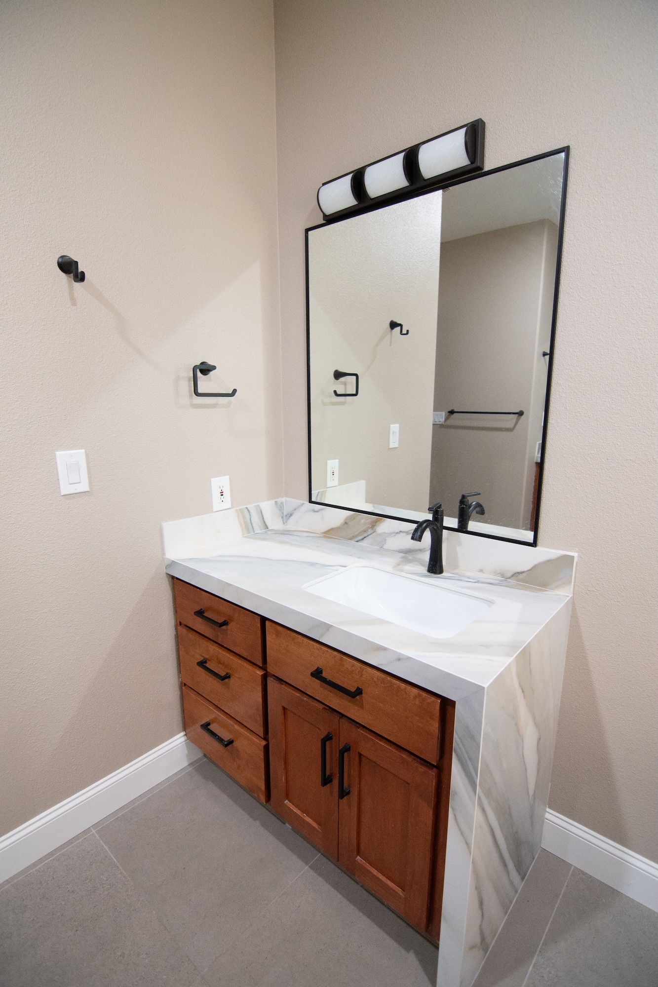 The custom vanity features warm wood cabinetry paired with a marble-style countertop and modern black hardware, blending warmth with refined finishes. A large mirror and contemporary lighting enhance the room’s brightness while maintaining a clean, streamlined aesthetic.
